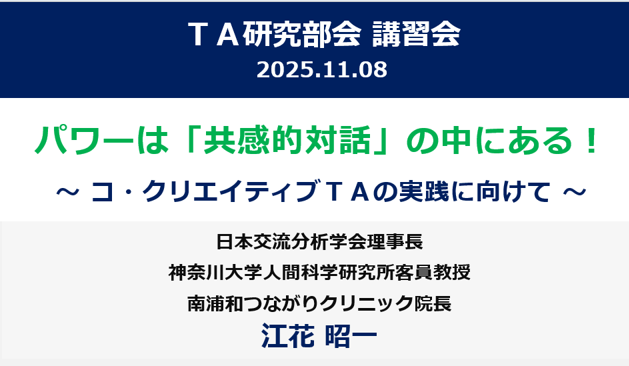 当日は、日本交流分析学会理事長の江花昭一先生に「パワーは「共感的対話」の中にある!~ コ・クリエイティブTAの実践に向けて ~」と題してお話しいただきました。大変好評でした。